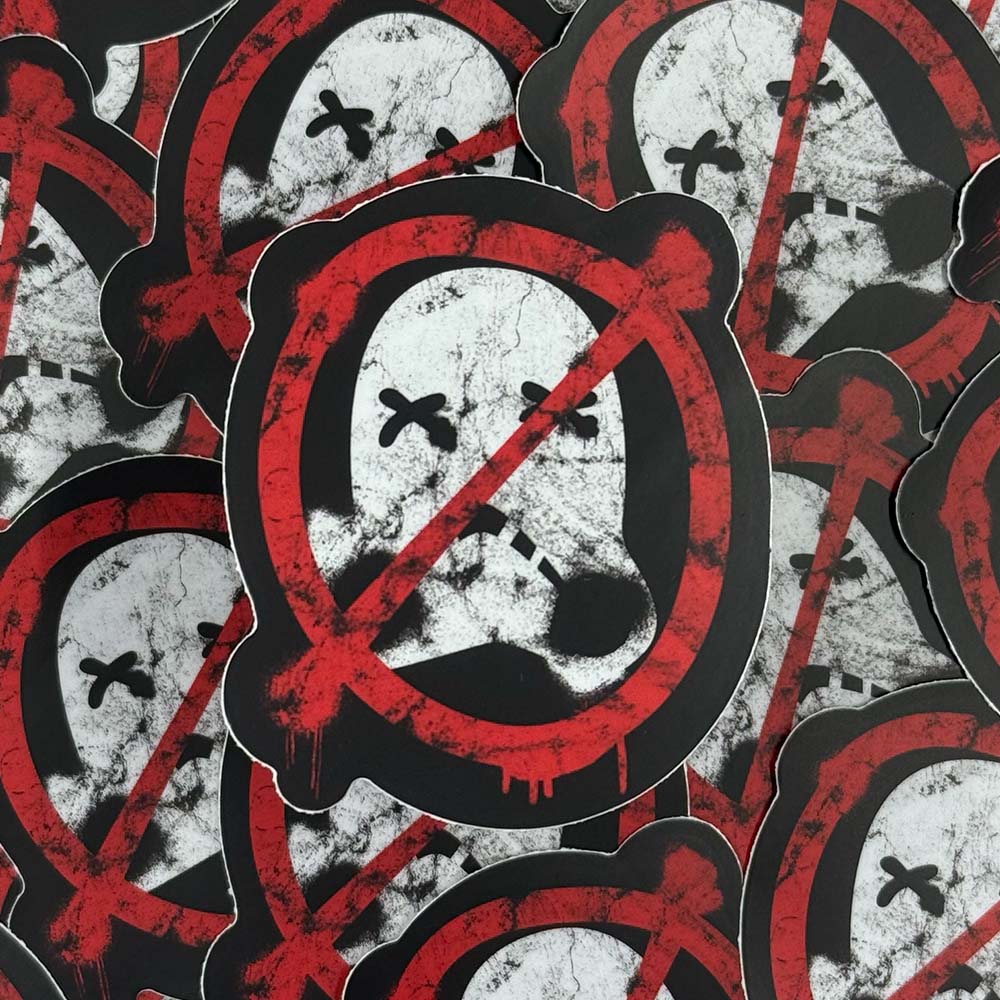 This 3" matte vinyl sticker features a stormtrooper bucket tagged out in bold rebellion red. A symbol to mark your datapad, cargo crate, or starship hull — loud and clear: No Imps Welcome.